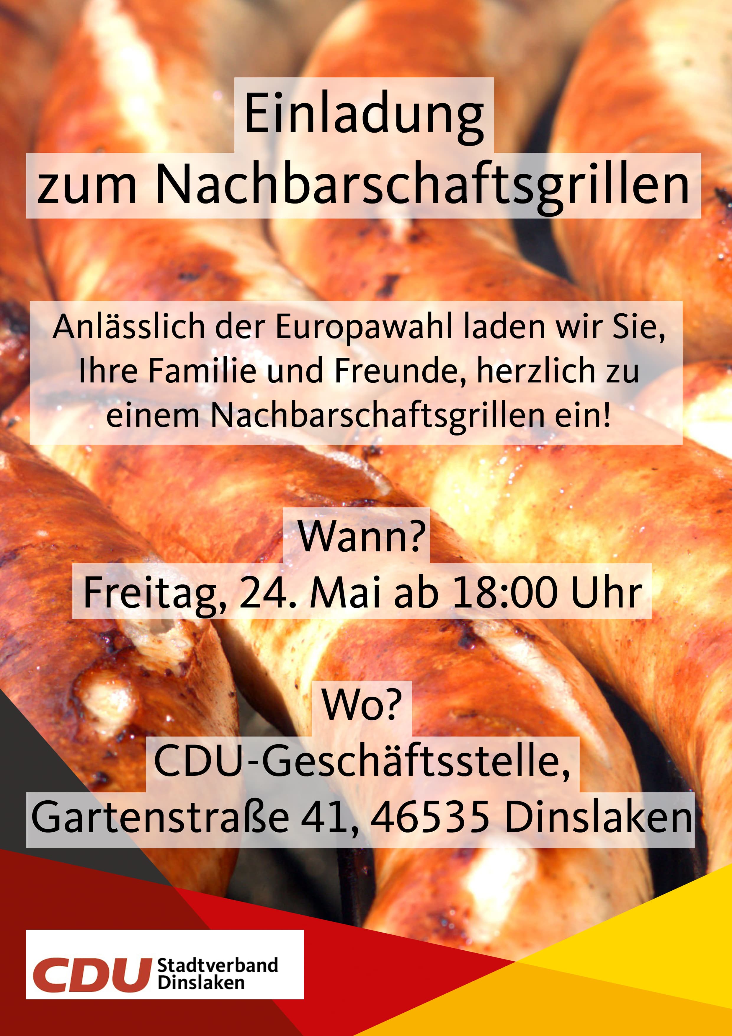 im Namen des Ortsverbandes Stadtmitte-Averbruch möchte ich Sie, Ihre Familie und Freunde, anlässlich der Europawahl ganz herzlich zu unserem Nachbarschaftsgrillen am Freitag, 24. Mai ab 18 Uhr, CDU-Geschäftsstelle, einladen.