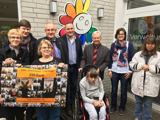 Beim Verein für Körper- und mehrfachbehinderte Menschen Alsbachtal hat man sich über den Besuch von Simone-Tatjana Stehr (li.) und Wilhelm Hausmann (Mitte) sehr gefreut. Die CDU-Landtagswahlkandidatin für Sterkrade und Dinslaken und der Landtagswahlkandidat für Alt-Oberhausen und Osterfeld übergaben Alsbachtal-Geschäftsführer Josef Wörmann (4. v. li.) eine Spende über 250 Euro, die bei der sogenannten „Osterhasen-Challenge“ gesammelt wurden. Für jedes Foto mit dem CDU-Osterhasenohren-Plakat, das der Partei geschickt worden war, spendeten Stehr und Hausmann einen Euro. Eine weitere Spende über 250 Euro werden die CDU-Kandidaten für die Landtagswahl am 14. Mai am Dienstag der Oberhausener Lebenshilfe überreichen.